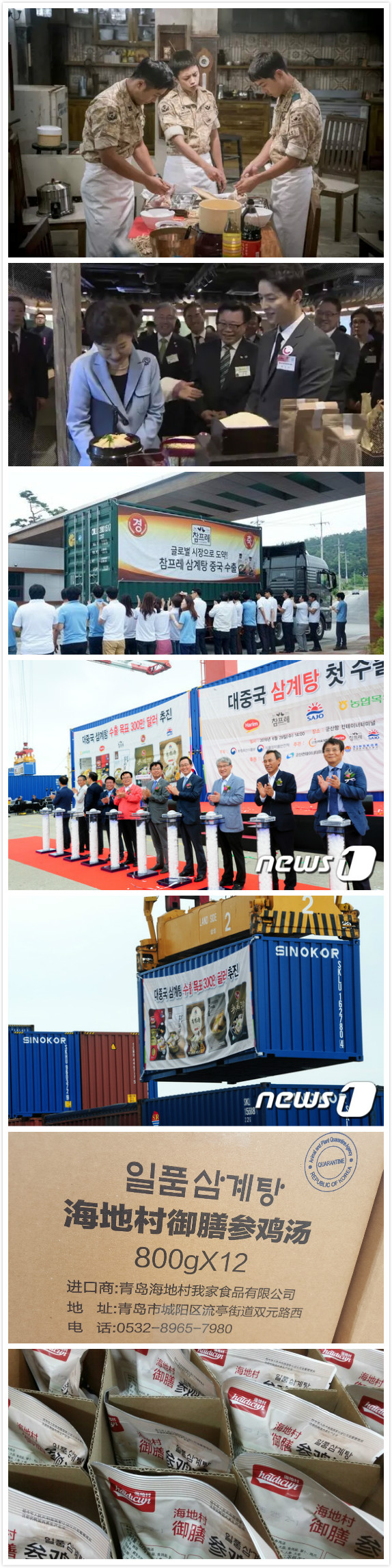 韩国参鸡汤正式实现对华出口业务,6月29日生产企业为即将发往海地村的首批参鸡汤产品举行纪念仪式。 韩国农林畜产食品部6月29日在全罗北道群山港与食品医药品安全处、出口企业等共同举行“参鸡汤首次对华出口纪念仪式”,装有20吨参鸡汤的集装箱装船起运。韩国农林畜产部李东碧长官、全罗北道道执事宋河珍等参加纪念仪式。 6月29日下午韩国全罗北道群山货运港口,首批出口中国的参鸡汤集装箱装船,预计于7月中上旬抵达青岛港并进入海地村仓库,这批参鸡汤将经过进口检疫和海关程序,预计于7月底或8月初将通过海地村庞大的物流网络在中国各大城市的大型超市或购物网站开售,进入中国消费者餐桌!
