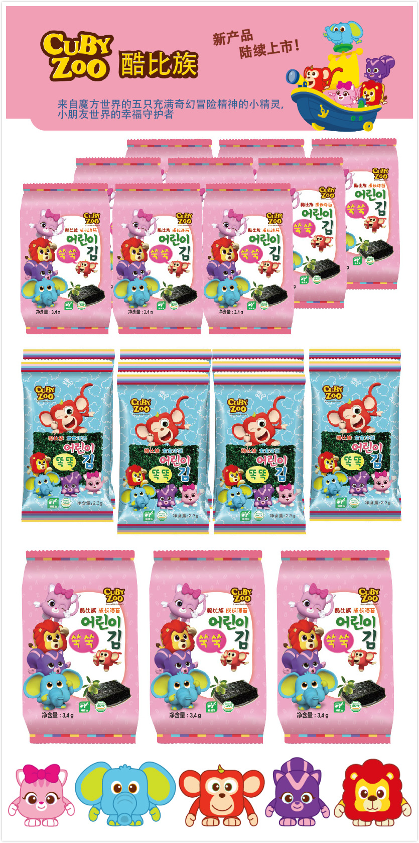 酷比族系列产品终于要正式和您见面了!想想都觉得好鸡冻的呢~今天就让酷比族系列的儿童海苔产品提前给大家亮个相!酷比族系列海苔,其原材料选用韩国上等紫菜,特点是松脆、薄、美味又健康,更适合儿童成长。与此同时 ,可爱的小精灵更吸引宝宝的目光,增加趣味!