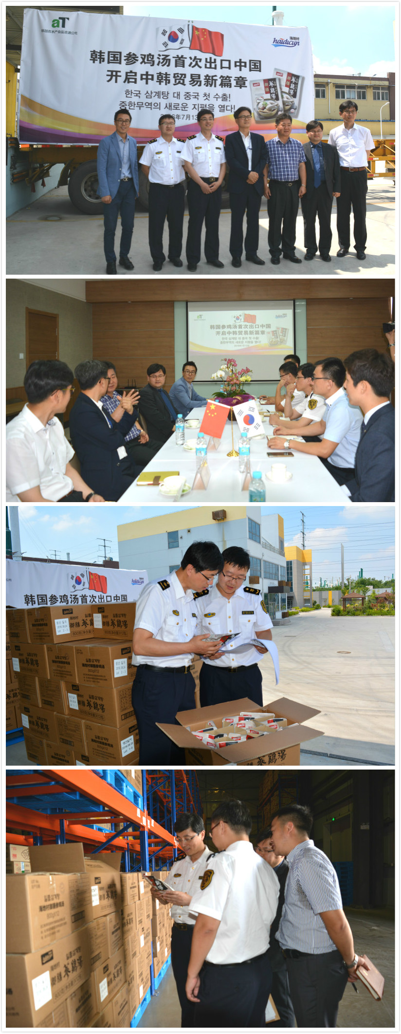13日,韩国参鸡汤由青岛口岸入境,当日,海地村携手aT韩国农水产流通公社在aT青岛物流中心,为出口中国的韩国参鸡汤成功登陆青岛举行简短的庆祝仪式。韩国驻青岛总领事李度基,aT青岛支社成光敦社长、青岛出入境检验检疫局相关工作人员等参加了庆祝仪式。